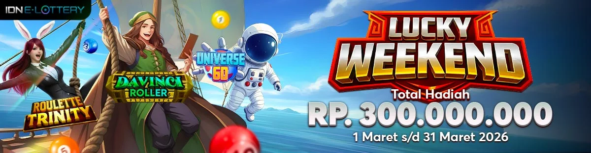 LUCKY WEEKEND oleh IDN E-Lottery akan berlangsung mulai 1 Maret 2026 hingga 31 Maret 2026 setiap hari, pukul 00:00 WIB hingga 23:59 WIB. Total hadiah cash drop adalah sebesar Rp 300,000,000 dan akan dibagikan kepada pemain yang beruntung setiap harinya.